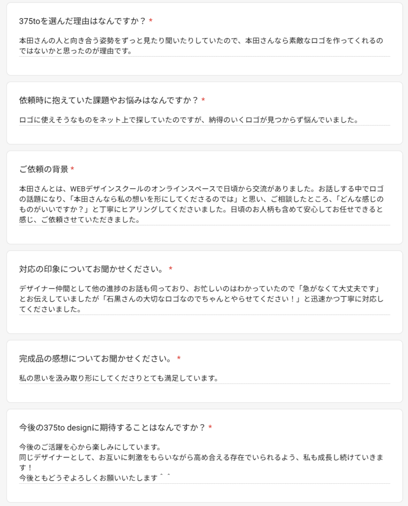 zoomで実際にお話しする中で、石黒様の屋号や理念、考え、そして秘めた想いをお話しいただけたので、その大切な石黒様の想いをロゴに込められるように、アイデアを振り絞り制作させていただきました。文章だけのやり取りでは得られないものがあるのでzoomでお話ししたり、可能な場合は実際にお会いして、コミュニケーションを取ることでより良いものをご提供できると考えておりますので、そのスタンスで今回も対応させていただきました。石黒様、この度はご相談から、ご依頼いただきまして誠にありがとうございました。