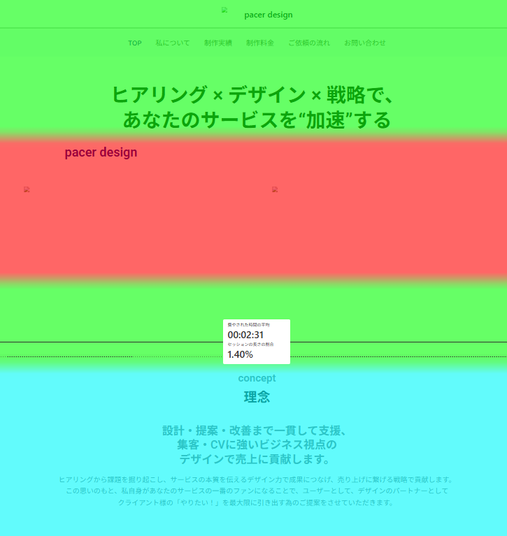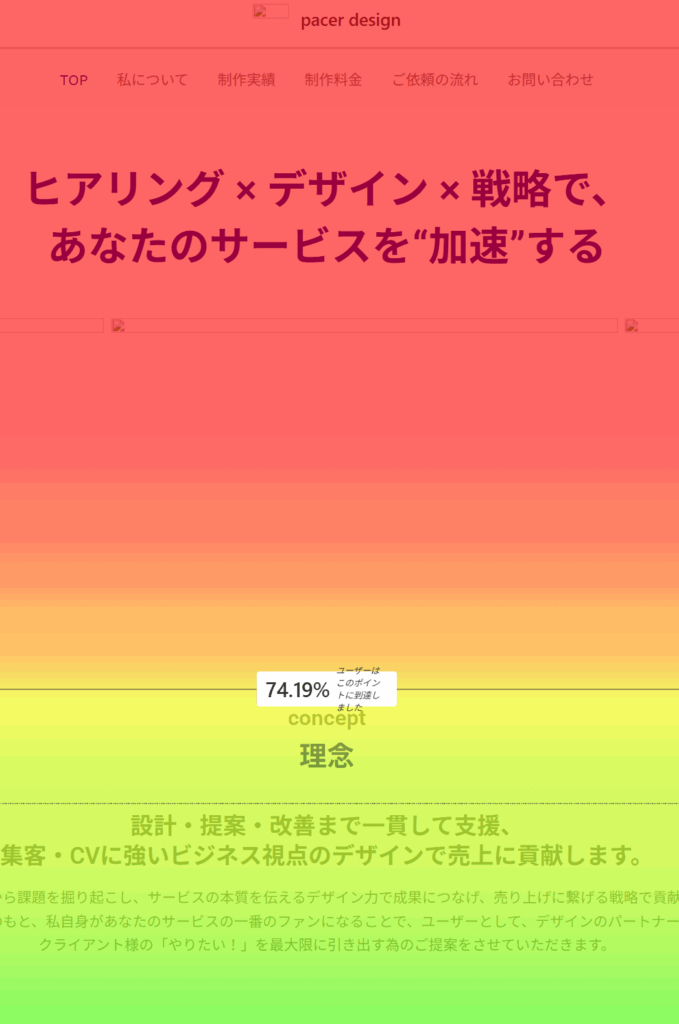 ページのどこまでスクロールされたかが色とパーセントで分かるので、特に離脱が激しいセクションの見直しや、構成の変更などの改善点が分かります。